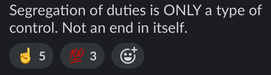 A number of attendees caught up with me after my session and commented about how the portion of my talk on segregation of duties (SOD) controls really resonated with them. Reading through the Slack comments that had been posted during my session confirmed this.